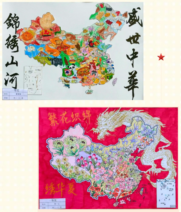手中笔墨流转,笔下山河壮阔。近日,我校八年级地理“锦绣中华”创作比赛正式落下帷幕。这场以地图为载体的创意比拼,吸引了八年级学子广泛参与。同学们以线条为骨、色彩为韵,将对祖国壮丽河山的理解与热爱尽数熔铸于一幅幅匠心独具的作品之中。