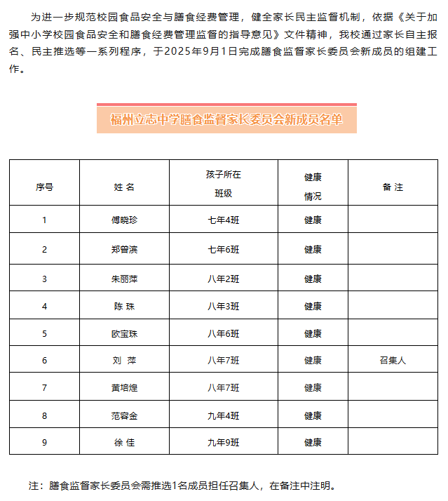 福州立志中学组建2025-2026学年膳食委员会及膳食监督家长委员会
