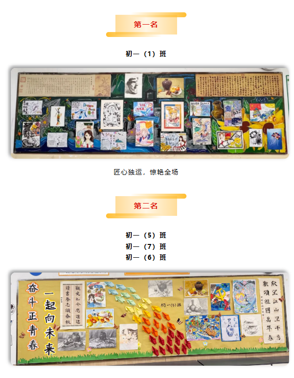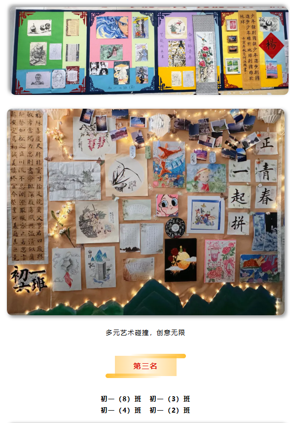 初一年段各班以教室为展台,精心布置主题展板。从水墨丹青到现代漫画,从书法拓印到光影摄影,色彩灵动,风格各异,方寸之间尽显艺术万象,传递时代气息。