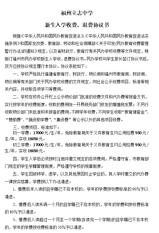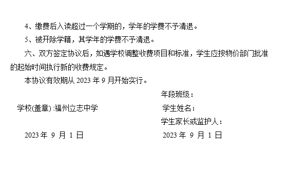 福州立志中学2023年新生入学收费、退费协议书