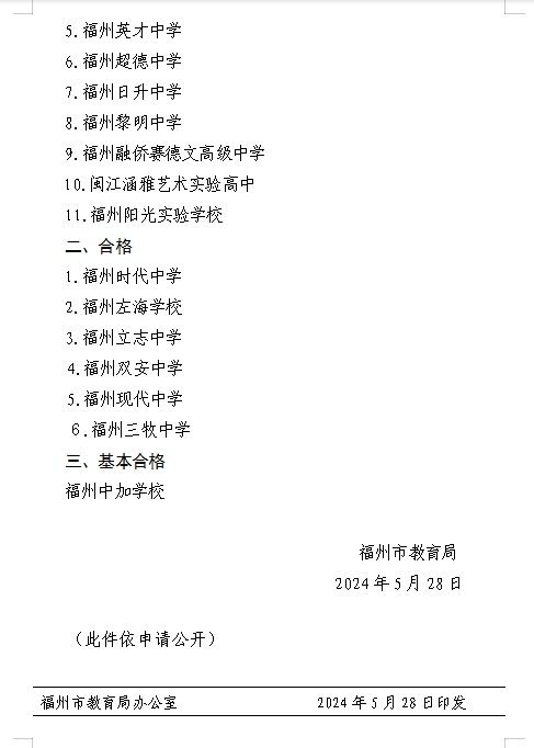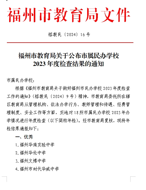 福州市教育局关于公布市属民办学校2023年度检查结果的通知